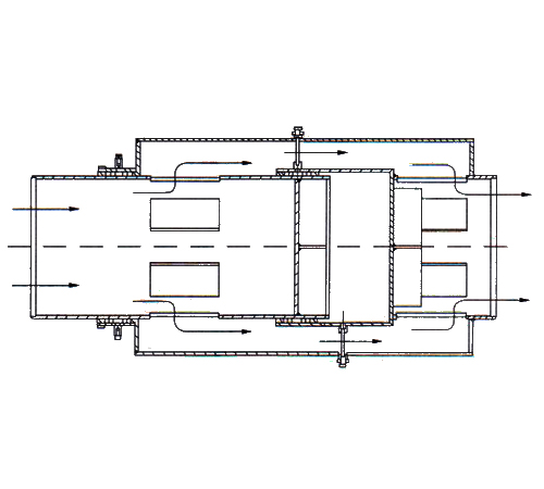 結(jié)構(gòu)特點是:外套管串聯(lián)兩個填料密封箱,內(nèi)套管后端加擋板,流體經(jīng)內(nèi)套管的孔道引到兩密封箱間隔腔,再經(jīng)外套管間隔腔處孔道,引回到后部加擋板的主管道。這種補(bǔ)償器比平衡腔式補(bǔ)償器減少一個密封箱,結(jié)構(gòu)簡單,但比平衡腔型補(bǔ)償器重量大,安裝尺寸長。